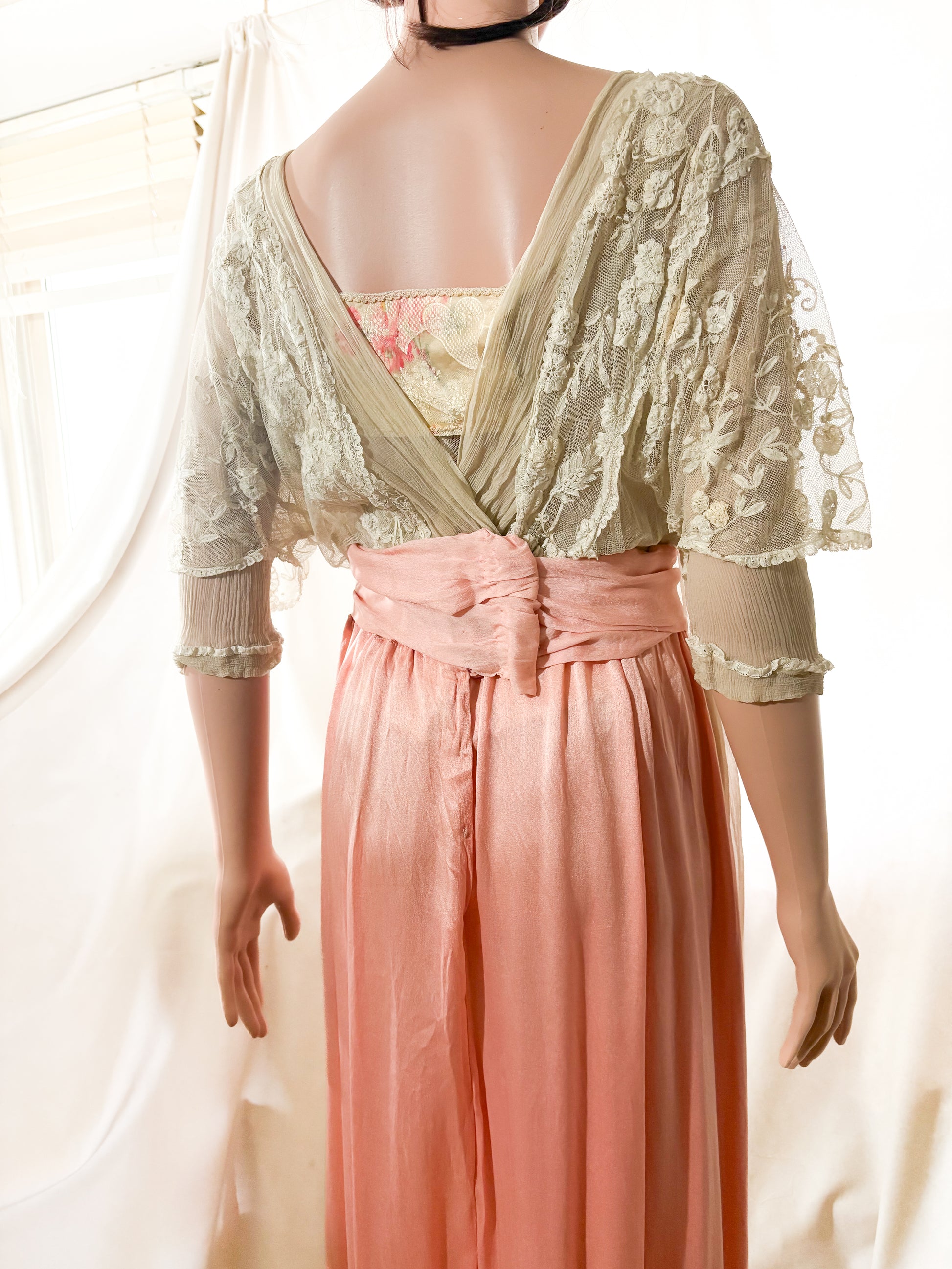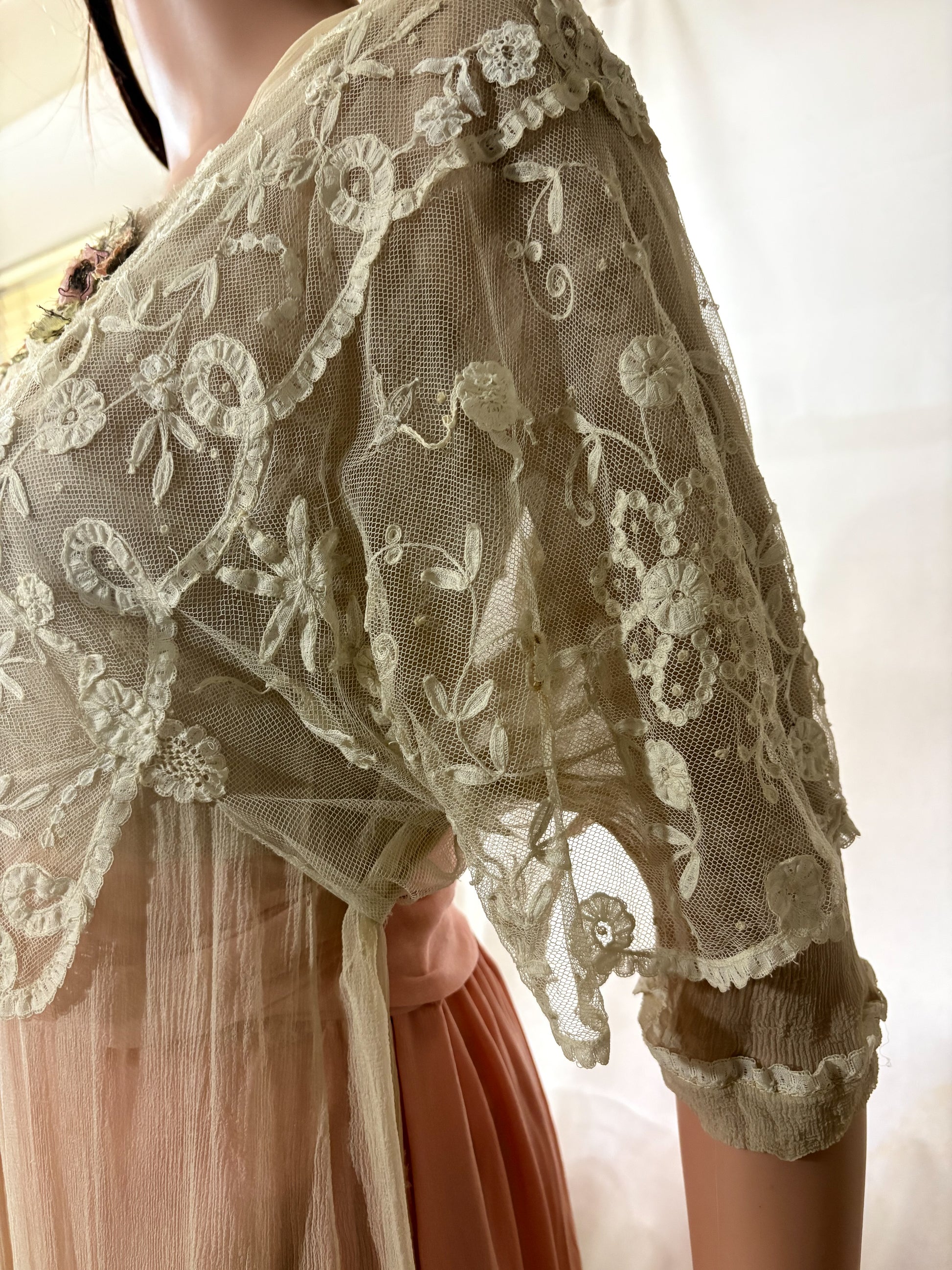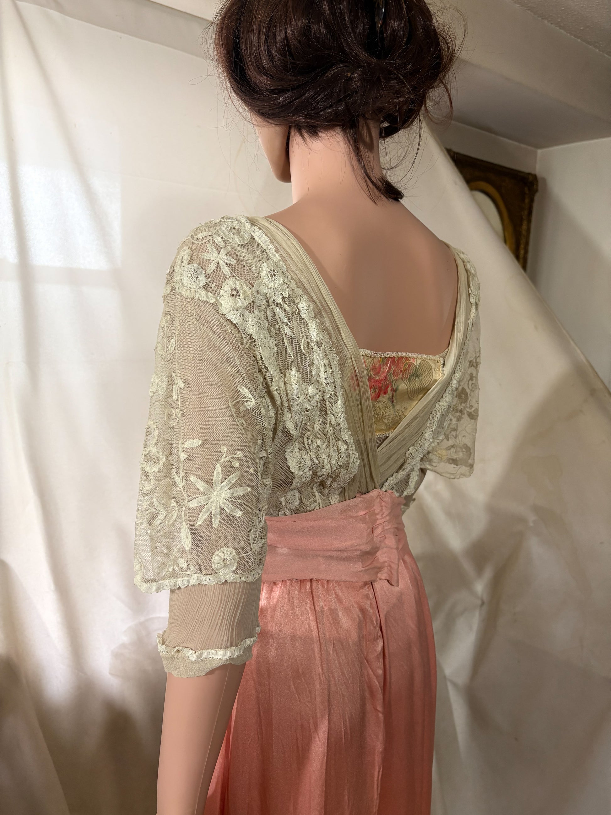 Authentic early 20th century Edwardian lace dress featuring original handmade silk floral embellishments. This piece dates to approximately 1908–1916 and reflects classic Edwardian lingerie-dress construction.