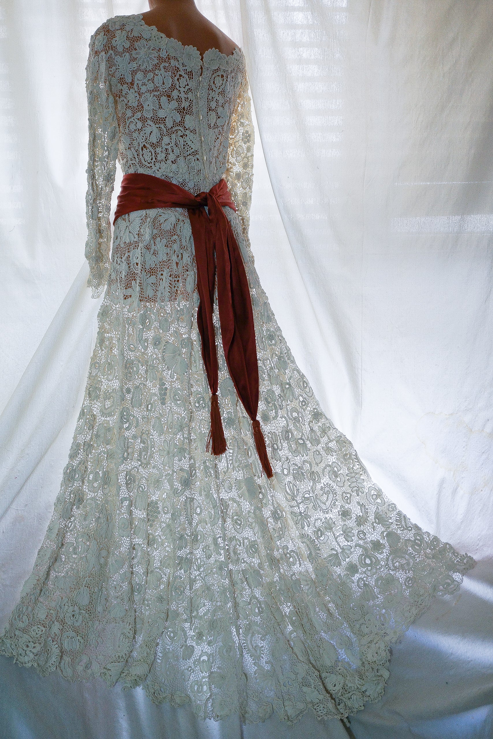 This is a formal lace evening or tea gown, possibly used for special indoor events or summer formal wear.