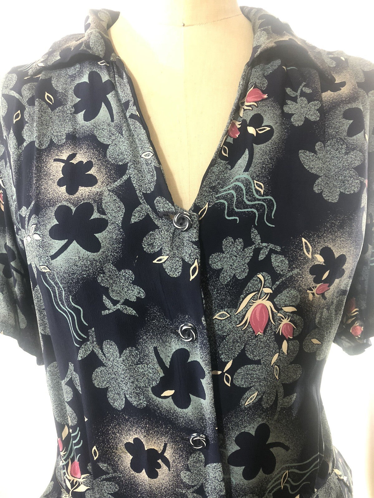 Step into the charm of the 1940s with this cool rayon dress, featuring a stunning novelty print.