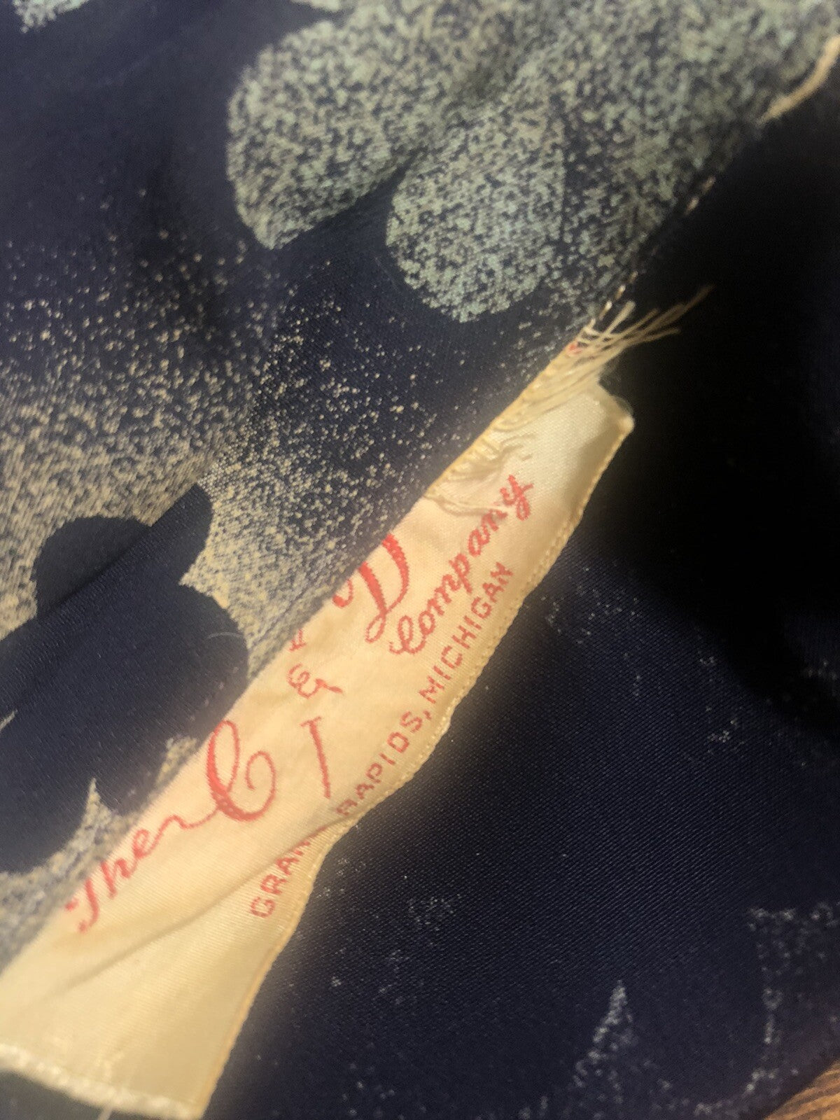 This unique dress was designed in the 1940s, when many young women took the factory jobs (after the male population left to fight WW2) .